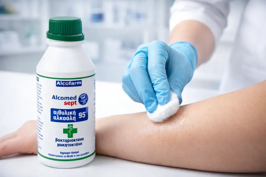 Εφαρμόστε μικρή ποσότητα Αιθυλικής Αλκοόλης 95° στο σημείο που επιθυμείτε να απολυμάνετε και τρίψτε έως ότου στεγνώσει, για τουλάχιστον 30 δευτερόλεπτα. Κατά τη διάρκεια της εφαρμογής, διατηρήστε την επιφάνεια υγρή ώστε να εξασφαλιστεί η σωστή αντισηπτική δράση.