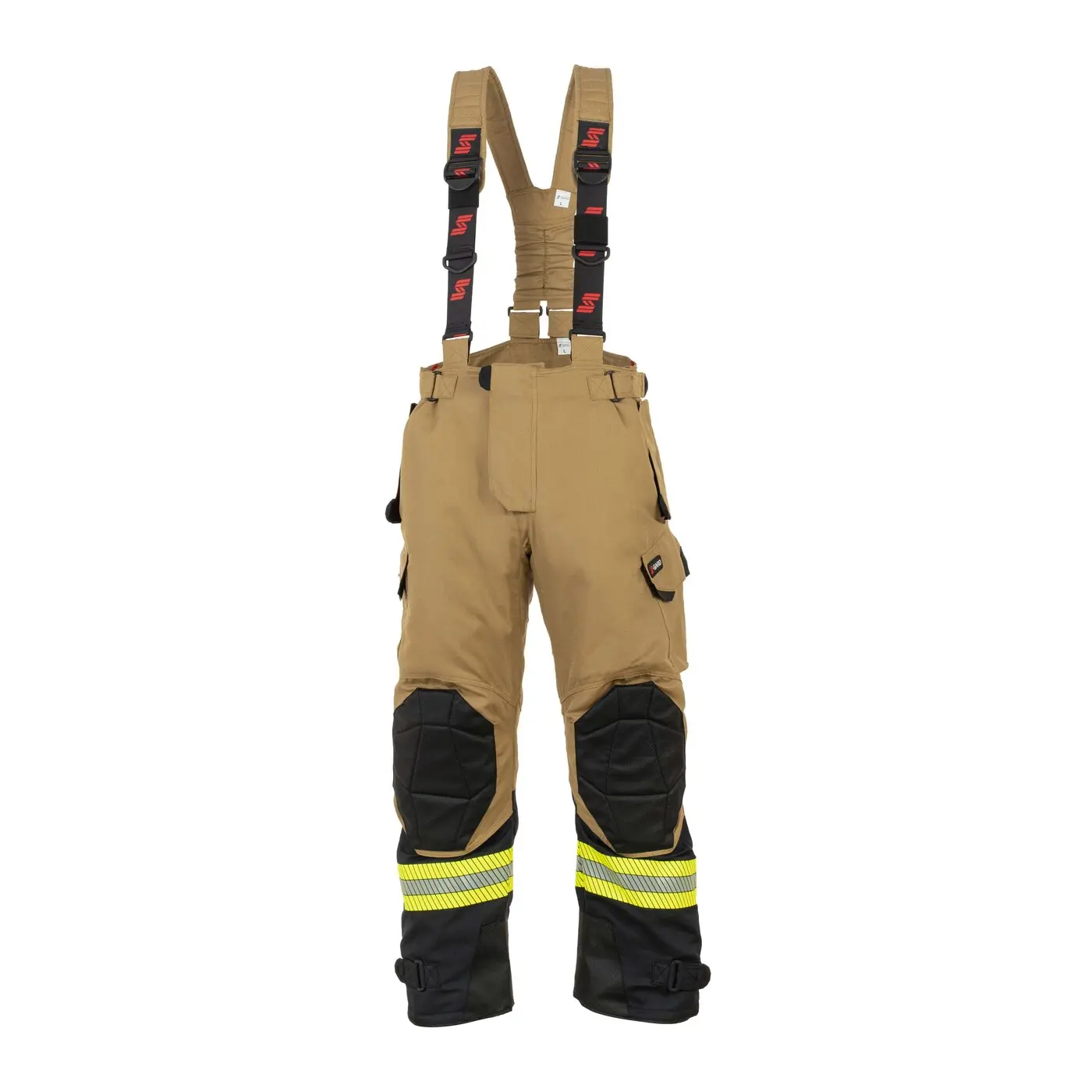Η περισκελίδα διαθέτει εξωτερικό ύφασμα Titan 1220 με τεχνολογία Hainsworth®, βάρους 220 g/m², το οποίο αποτελείται από 89% DuPont™ Nomex®, 9% DuPont™ Kevlar® και 2% P140 αντιστατική ίνα, με υδροαπωθητικό φινίρισμα Repel+ για αυξημένη ανθεκτικότητα. Ως φραγμό υγρασίας και θερμικής μόνωσης χρησιμοποιείται η μεμβράνη GORE-TEX® Fireblocker, ενώ η εσωτερική επένδυση είναι ειδικό τρισδιάστατο ύφασμα 200 g/m², αποτελούμενο από 93% Nomex®, 5% Kevlar® και 2% P140 αντιστατική ίνα, προσφέροντας άνεση, προστασία και υψηλή διαπνοή.